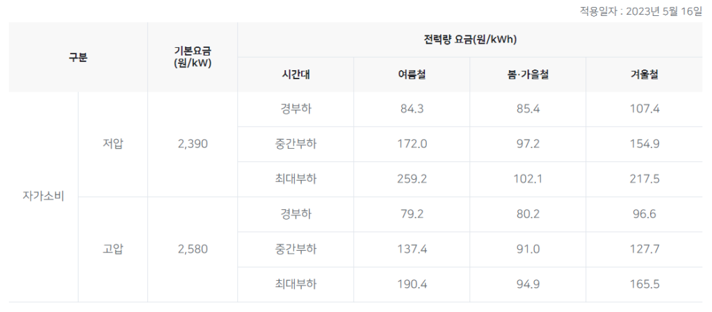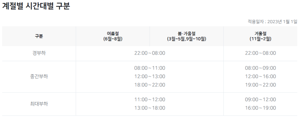 한국전력의 전기차 충전요금의 경우에는 계절에 따라, 경부하 / 중간부하 / 최대부하 시간대별로 다른 요금이 부과되어집니다.