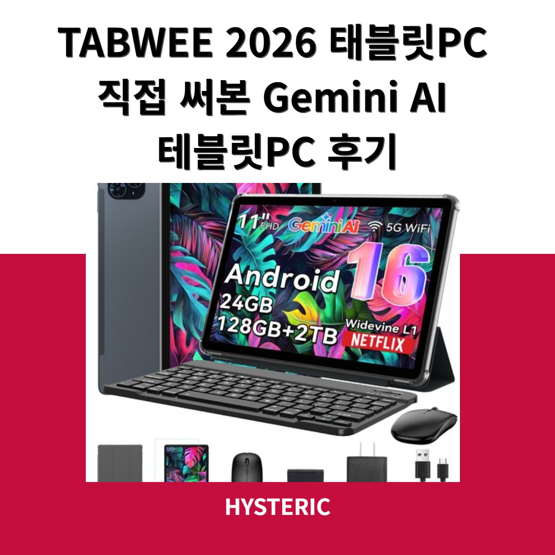 원래 쓰던 건 7인치태블릿이라 전자책 읽기엔 좋았는데, PPT 수정이나 엑셀 파일 열어보는 순간 한계가 확 느껴졌습니다. 삼성테블릿PC도 후보에 올려놓고 계속 비교하다가, 스펙 대비 가격이 눈에 띄던 제품이 바로 TABWEE 2026 Gemini AI 태블릿PC였어요. 11인치 FHD에 Android16, 여기에 AI 기능과 키보드 세트까지 포함된 구성이어서, ‘이 정도면 출퇴근용+간단 업무용까지 커버되겠다’ 싶었습니다.